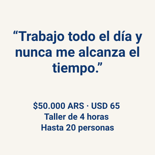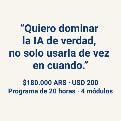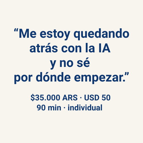 Llegás con tu celular o computadora y un problema real de tu trabajo diario. En 90 minutos configuramos juntos tu primer asistente de IA personalizado para esa tarea. Salís con algo funcionando — no con teoría. Incluye: Sesión de 90 minutos (presencial o videollamada) + asistente de IA configurado a tu medida + guía de uso.