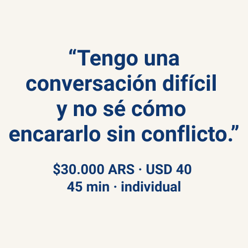 Traés la situación — una renuncia, un límite que poner, una propuesta que no podés comunicar bien — y en 45 minutos diseñamos juntos el mensaje exacto. Con estrategia emocional e IA aplicada. Salís con el texto listo para enviar.