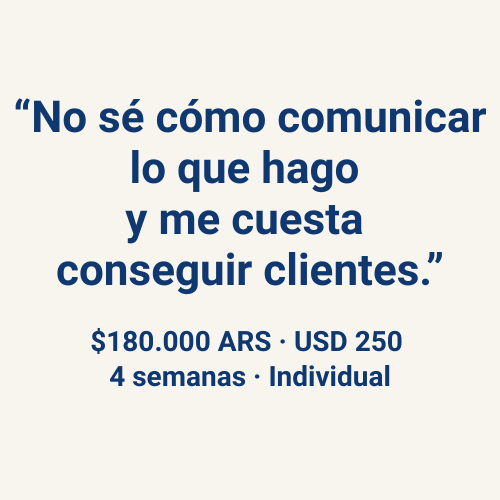 Cuatro semanas de acompañamiento individual para construir tu propuesta de valor, optimizar tu presencia profesional y crear un sistema de comunicación que atraiga a los clientes correctos. Usamos IA para acelerar y comunicación estratégica para dar dirección. Incluye: 4 sesiones de 60 min + acompañamiento WhatsApp + propuesta de valor + perfil LinkedIn + sistema de contenido.